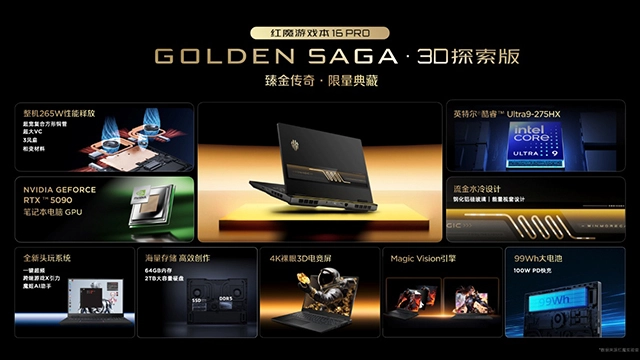 在游戏本上,红魔游戏本16 Pro全新升级GOLDEN SAGA·3D探索版,搭载英伟达5090显卡,拥有64GB+2TB存储,并且首次在笔记本上带来了流金水冷设计。