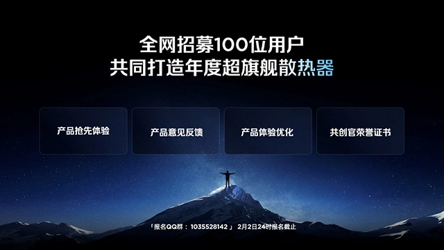 在此次发布会上,姜超还正式启动了《你的设备散热需求,红魔为你满足》活动,计划邀请五位数码爱好者,为他们量身定制专属的散热设备。与此同时,红魔面向全网开启招募,寻找100位用户参与红魔散热器新品的内测环节,旨在与用户携手打造年度超旗舰级散热器。这款散热器定名红魔散热器8 Pro,预计在年后正式推出。