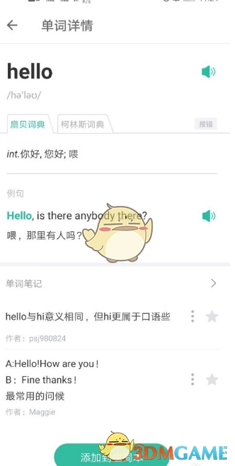 3、点击该条目,进入后便能看到十分详细的释义。倘若想在app中通过背诵单词来进一步学习,点击下方的“添加到生词本”即可。