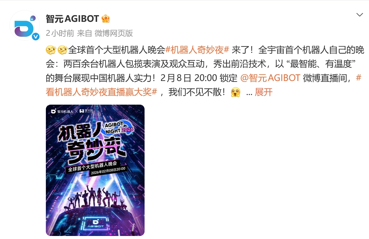 如今机器人公司纷纷上桌春晚,智元自然也要上一波。只不过,它选择了自己当主角,不靠春晚,也能刷足存在感。