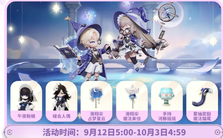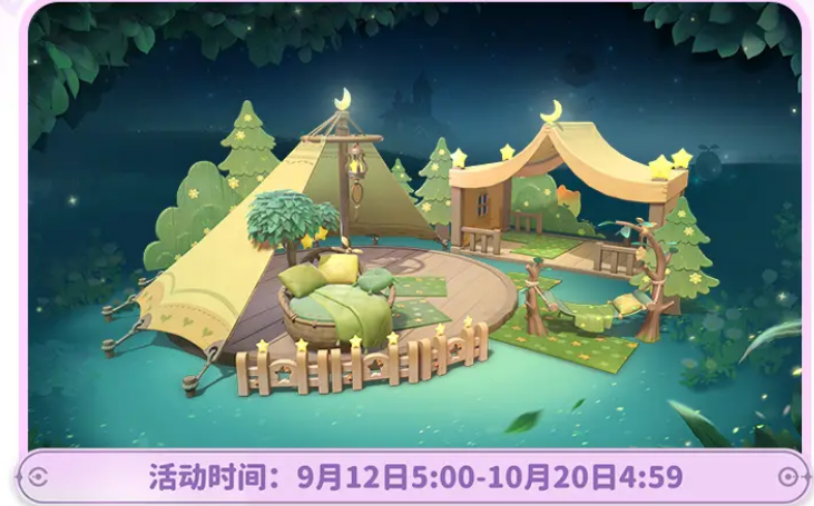 包含银河占梦师、星夜时光使、午夜新娘等奇幻套装,并可通过集点兑换特供单品如手持·河豚摇摇。森夜露营系列家具