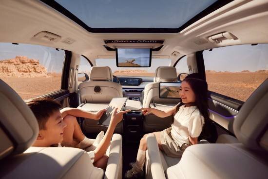 车内第二排同样配备了吸顶娱乐屏,冰箱也没有缺席,而且中控岛台还可以前后移动,形成贯穿式的前排主副驾通道,功能和实用性都非常出色。