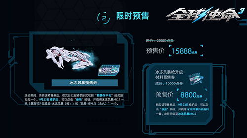 在全视角第三人称PVE射击网游《全球使命3》的凛冬战场里,一场极具颠覆性的冰霜革命即将强势来袭!全新超能武器“冰冻风暴”带着绝对零度的力量破冰亮相,限时预售活动同步开启!从现在起直到9月23日维护前,玩家可以享受8折的超值优惠,仅需15888点券就能把这把能冰封战场的利器收入囊中。更让人惊喜的是,一同推出的“冰冻风暴升级材料包”也会以6折的特惠价格(8800点券)开放预购,帮助你快速解锁武器的终极形态,在无尽战场上用寒霜之力压制敌军!寒潮已经到来,你,准备好成为冰封王座的掌控者了吗?
