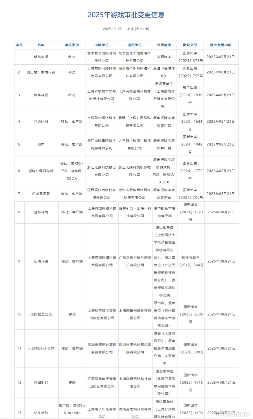 除此之外,本次游戏版号相关信息里,另有9款游戏提交了审批信息变更申请,像腾讯的《天涯明月刀·世界》新增客户端、调整版本;《迪士尼:书境传奇》更改名称;《矩阵:零日危机》增加主机端等情况都包含在内。