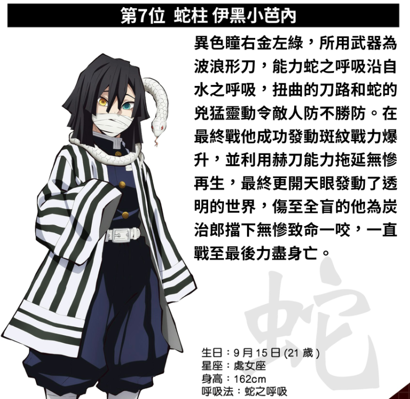金绿异瞳,蛇之呼吸。在那场终极对决中,他开启斑纹,点燃赫刀,甚至踏入“透明的世界”。最后为守护恋柱与炭治郎,硬接无惨致命一击,直至力竭倒下。若未分心照料蜜璃,他的战力或许还能再进一步。