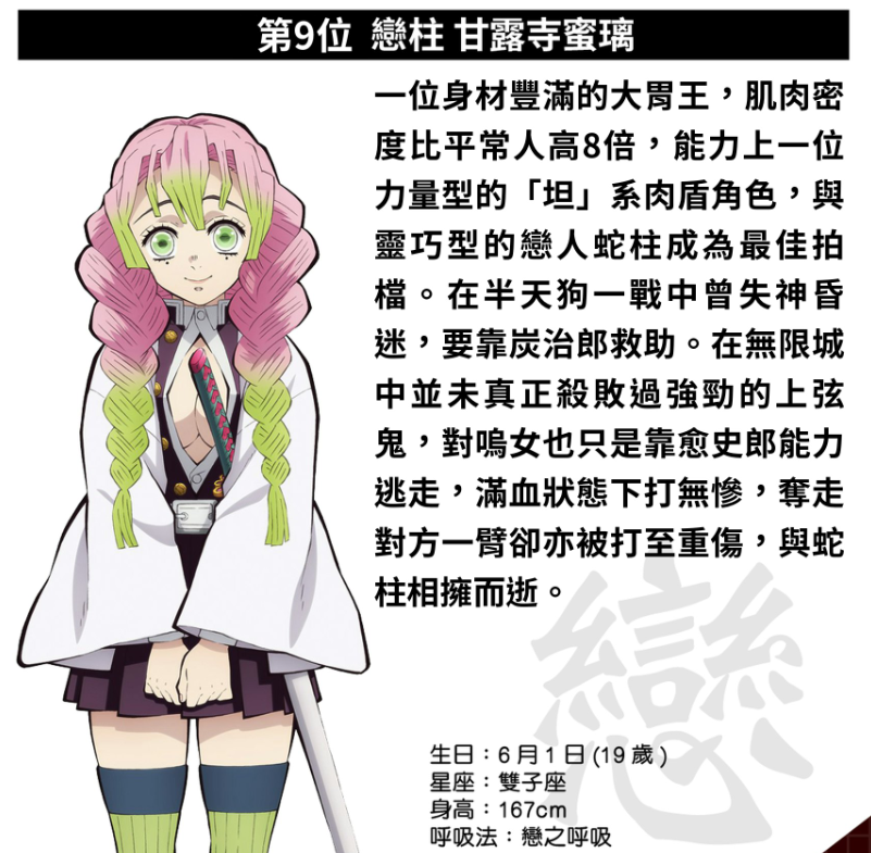 拥有“八倍肌肉密度”的奇女子,其恋之呼吸独树一帜。她看似温柔,内心却十分坚毅,力量与防御能力都颇为出色;不过性格单纯是她的短板,在刀匠村与半天狗对战时,最终是依靠炭治郎的帮助才结束了战斗。而她也在这场战斗中成功觉醒,爆发出斑纹,为炭治郎创造了至关重要的战斗契机。