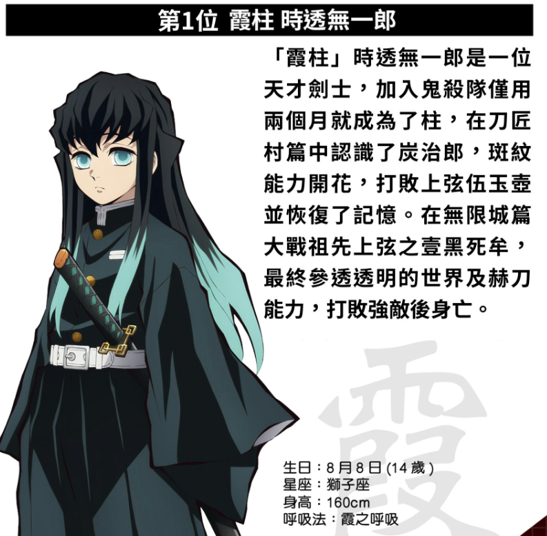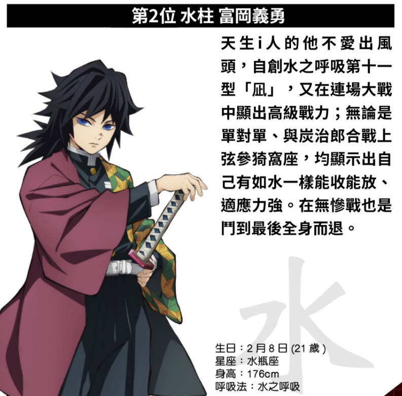 天才剑士,两个月就成柱。在无限城,他参透透明世界与赫刀,与风柱、炭治郎并肩杀死黑死牟,最后力尽而亡。短暂一生,却燃尽到极致。