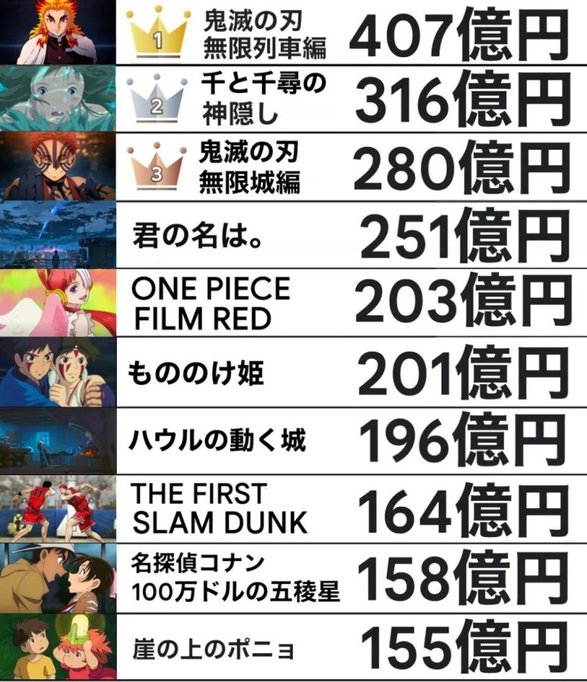 前面只剩下两座大山:宫崎骏的《千与千寻》(316.8亿),以及自家大哥《无限列车篇》(407.5亿)。