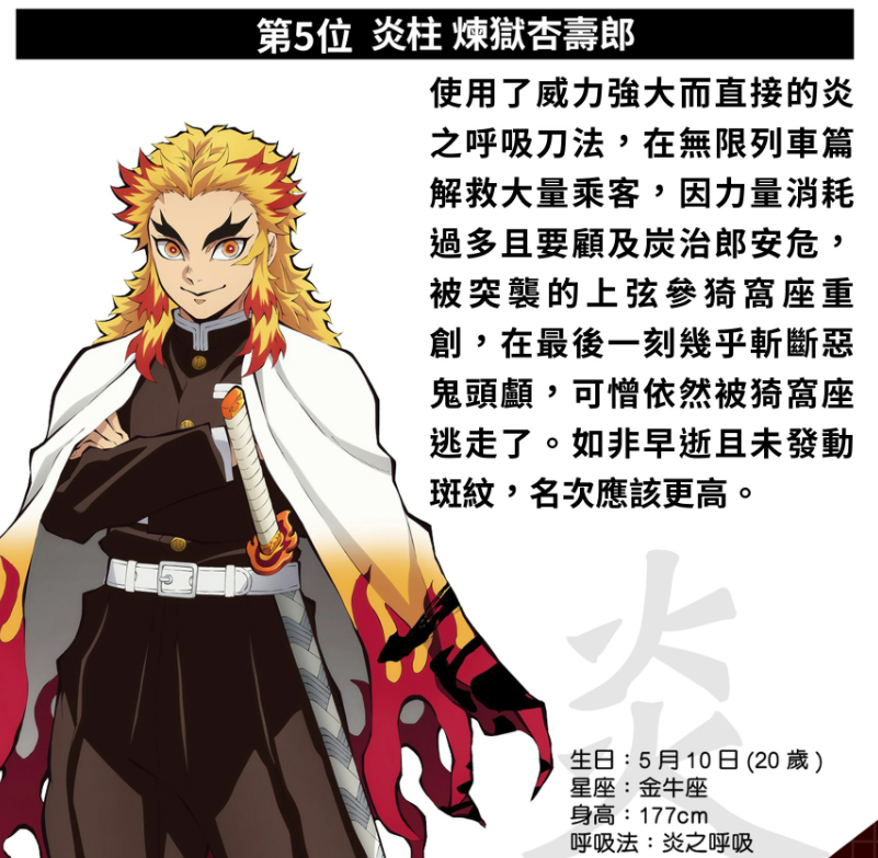 提到炼狱大哥,其实不用多说什么。在那趟无尽列车上,他独自迎战猗窝座,哪怕心脏被洞穿也丝毫没有退缩。虽然最后还是倒下了,但他用自己的生命护住了数百名乘客,更点燃了炭治郎他们的斗志。