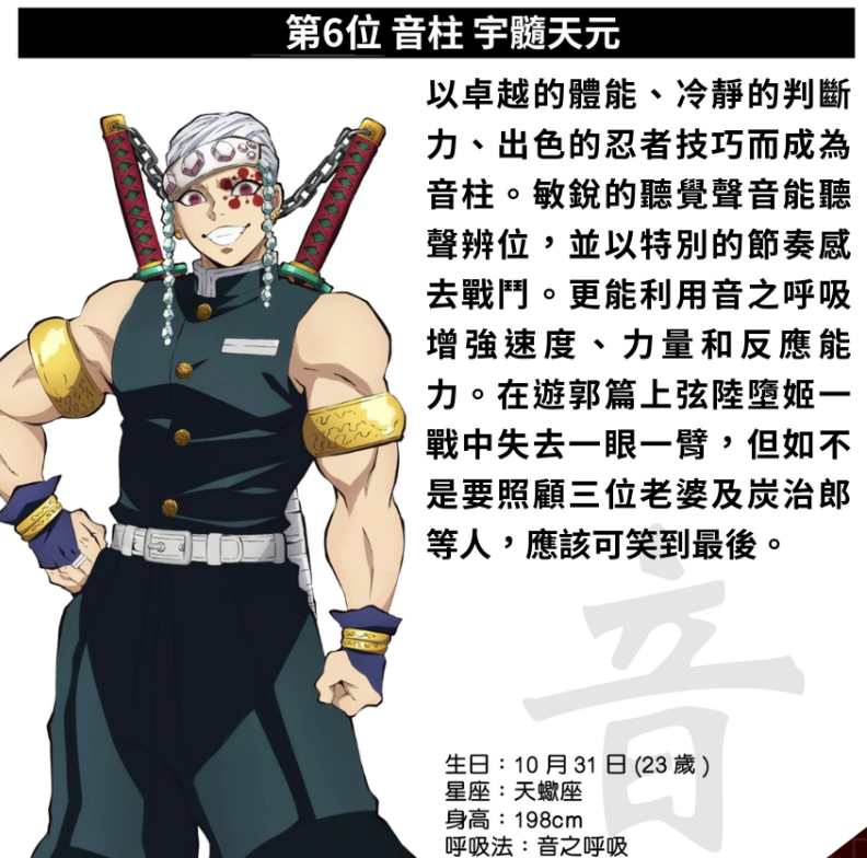 他是九柱里的“定海神针”。这位时常泪流满面的盲眼僧人,运用着「岩之呼吸」,他的日轮刀设计独树一帜。尽管双目失明,他却早早便掌握了「透明的世界」。在鬼杀队的「九柱」之中,他既是众人认可的领军人物,也是公认的最强者。