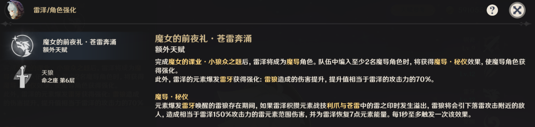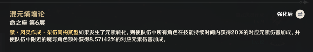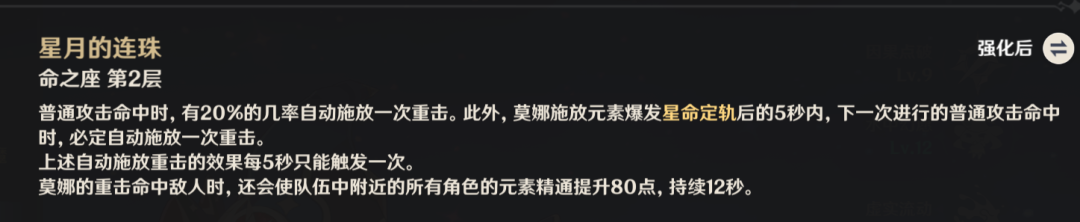 2命效果下,释放元素爆发后会自动触发一次重击,这样不仅能瞬间让大招持续时间延长4秒,还能额外增加80点元素精通。