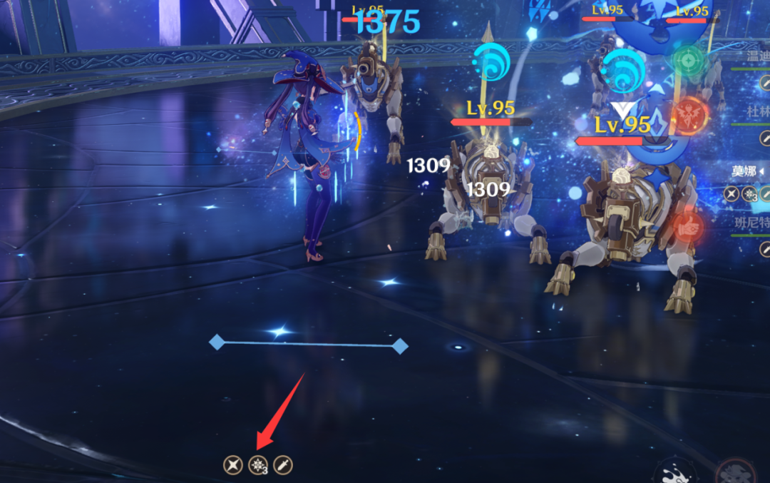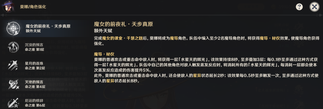 普攻或重击命中敌人时可叠加一层BUFF,该BUFF最多可累积至3层;当队伍中其他角色触发蒸发反应时,会消耗当前所有的BUFF层数,每消耗一层将为此次蒸发伤害提升5%。此外,莫娜自身的普攻与重击命中敌人时,还能延长大招的持续时间,单次延长效果叠加后最多可让大招持续8秒。这套机制让莫娜能够在前场持续作战,同时为后台的火元素主C提供稳定的蒸发增伤支持。