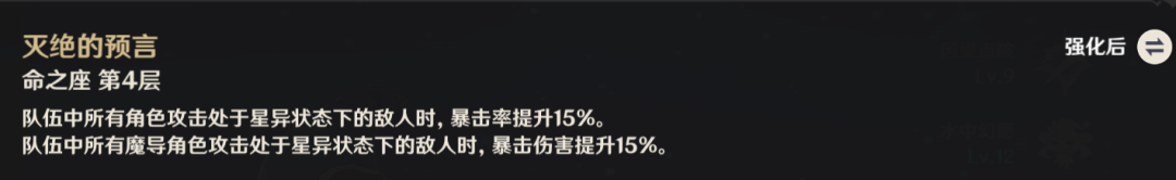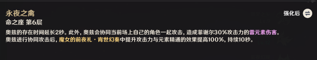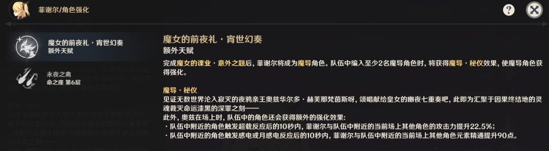 菲谢尔原本就是强度不错的四星后台角色,如今又增添了一定的辅助能力,在后台的作用愈发显著,特别是解锁六命之后,能为队伍提供45%的攻击力加成与180点元素精通,这相当于圣遗物主次属性上的一次大幅提升了。