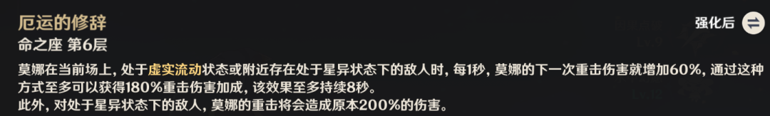6命效果调整后,无需移动即可触发,下次伤害提升60%;另外,当攻击处于异星状态下的敌人时,莫娜的重击伤害将达到原本的200%。