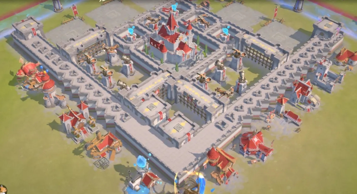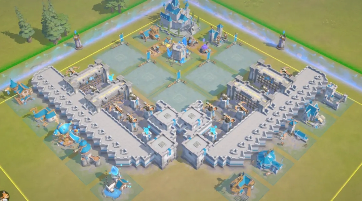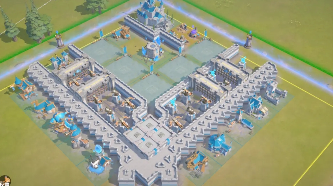 当然,除了常规布局外,还存在一种独具匠心的布局思路,即把城区范围集中在角落或某一特定方向,充分借助龙石结界的独特影响力,将敌军引向防御侧重的方向,从而达成更高效的城区防守。在这种布局模式下,城区范围显著缩小,城墙集中构筑于一侧,形成局部的坚固防御壁垒,而建筑则分布在城墙外围,依托城墙的掩护来提升自身的防御能力。
