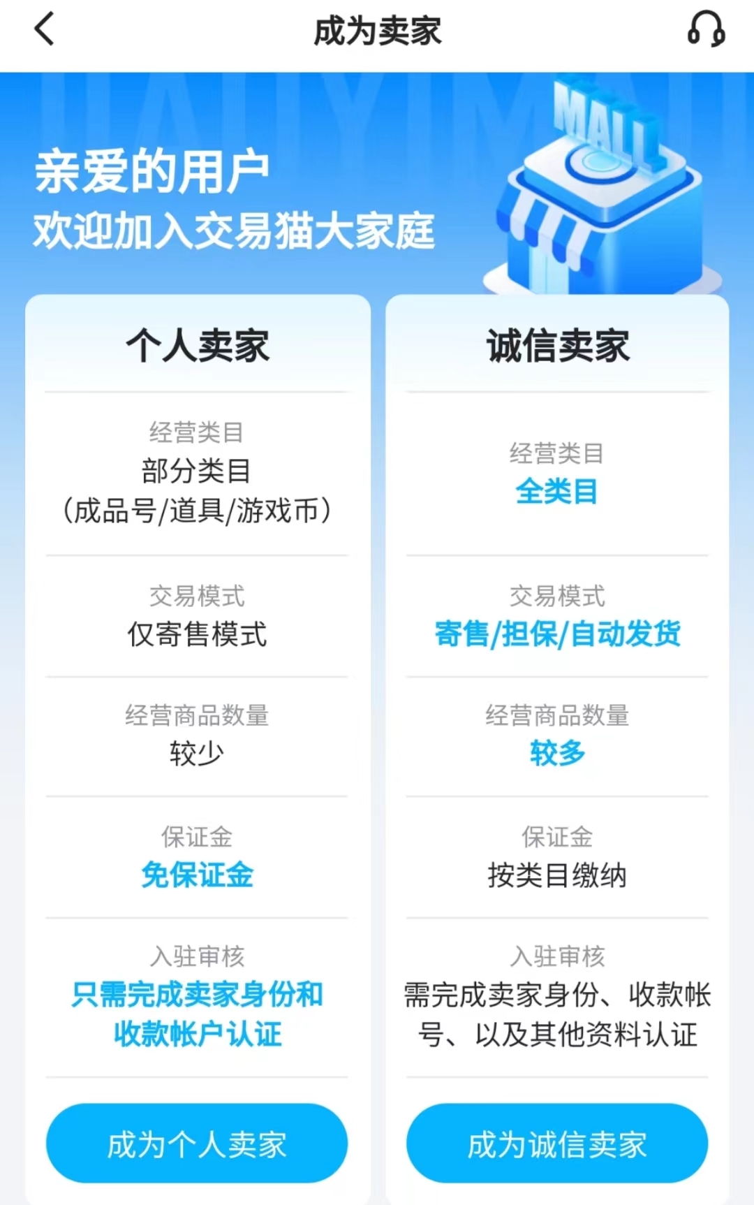 玩家在出售账号时或许会顾虑卖号流程太过复杂,不过在交易猫平台卖号完全不必有这种担忧。交易猫的卖号操作没有什么门槛限制,玩家只需完成卖家身份认证,成为交易猫的卖家就能上架自己的账号商品。并且交易猫为玩家提供了两种不同的卖家身份类型,玩家可以自主选择成为个人卖家或者诚信卖家。其中个人卖家不需要缴纳保证金,仅需进行实人认证并绑定相关账户就可以;而诚信卖家虽然需要缴纳一定金额的保证金,但这类卖家更容易获得买家的信赖,能够经营的商品数量和涉及的类目也会更多一些。
