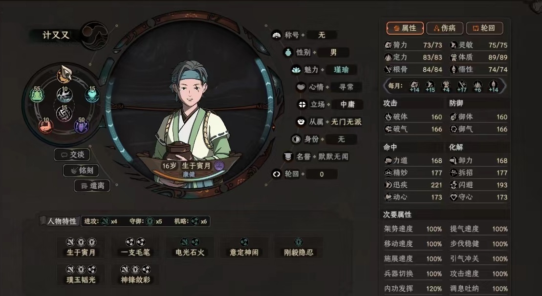 璞玉韬光的效果是提升艺技类书籍的研读效率,但表现不如上一个特性,因此评分仅3分。天材地宝可产出软硬铁、软硬木这类道具,评分2分。先利其器会随机提供制作工具,借助这些工具能打造出不少优质装备,评分3分。天人造化能增强身法与绝技的资质,这是当前评分最高的特性,达到5分,极为关键,会直接作用于战斗力。古冢遗刻可获取一本功法书,其种类与初始选择的门派相关,此外还有一本技艺书。