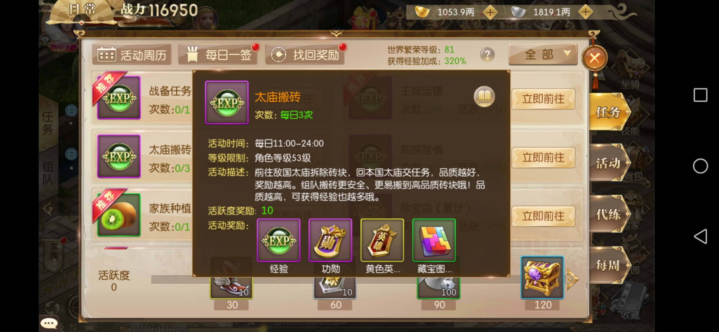 失去主线任务指引后,日常任务便成了获取经验的主要途径,而其中经验最丰厚、完成起来也最稳妥的当属战备任务。这项任务可在王城的卫国大将军处接取,属于连续的环式任务。任务内容并不复杂,主要是跑跑腿、打打怪,但由于需要前往的地点较多,因此建议大家使用小飞鞋来加快赶路速度,这样能节省不少时间。