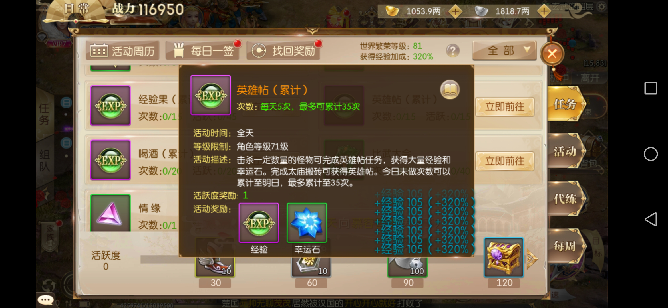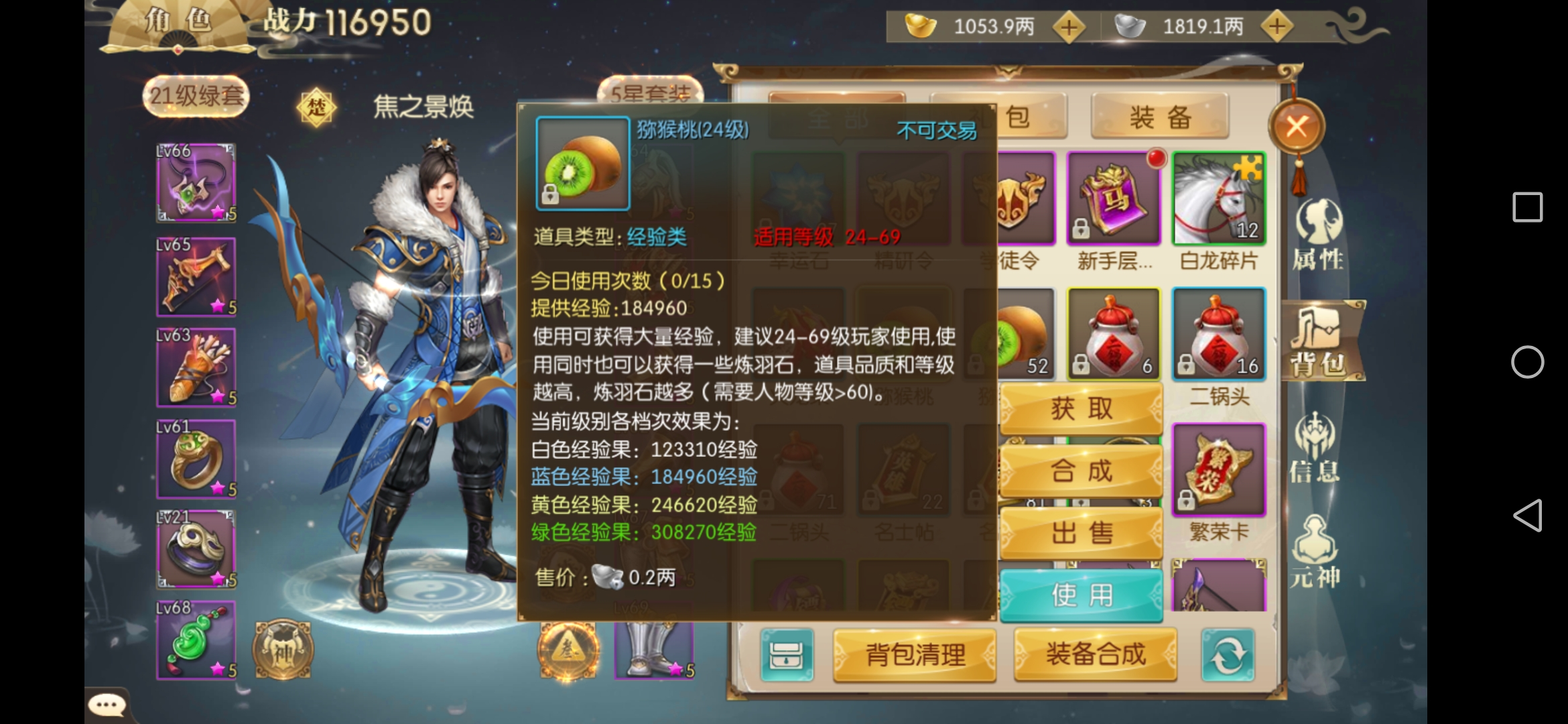 完成这些任务后,就只剩下英雄帖和经验果的部分了。经验果的获取方式最为简单,只需点击包裹中的猕猴桃即可。每天可以使用5个猕猴桃,因此建议大家尽量挑选品质较高的猕猴桃来使用,这样就能轻松获取大量经验了。