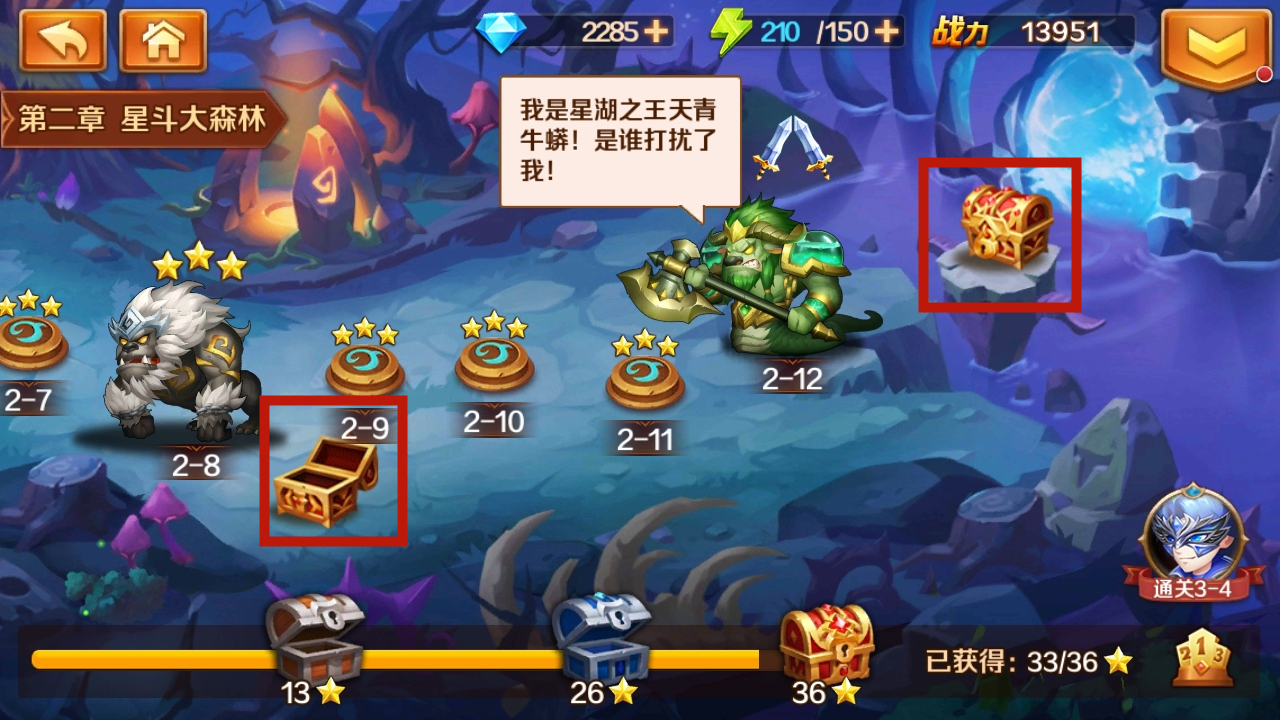 首先,游戏里获取钻石的主要方式是主线副本的奖励。就像上面的图展示的那样,每一章都设有三个对应星数挑战的宝箱奖励,打开它们分别能获得50、80、100颗钻石。对于新手而言,前期的关卡通关难度很低,所以能在这里迅速拿到不少钻石。除此之外,每一章还会出现小boss。正如上面第二张图呈现的,击败这些小boss就能领取一份额外的宝箱奖励,宝箱里也有一定概率开出少量钻石。