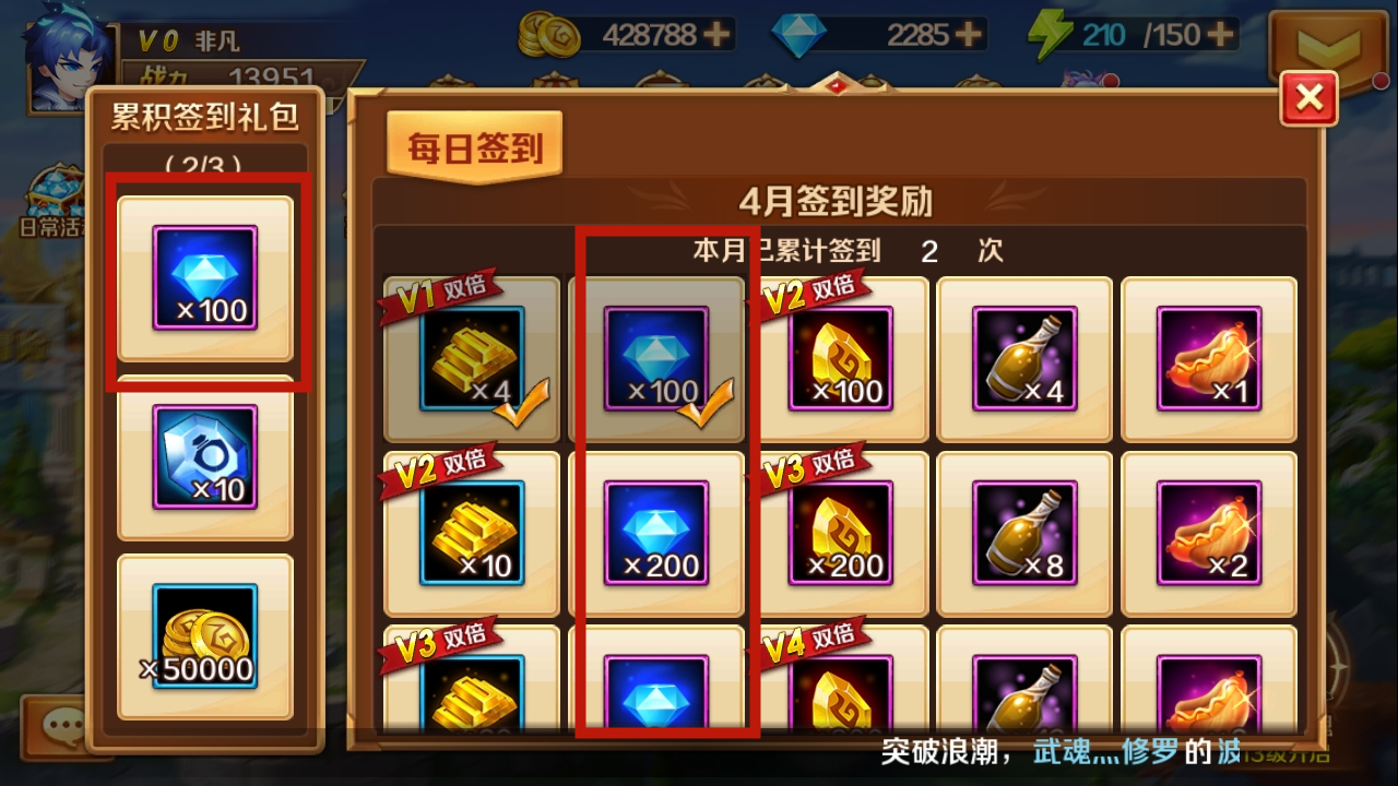 最后,每日签到也是获取钻石的重要途径。就像上面图片展示的那样,每月从第二次签到起,每间隔五次就能获得钻石奖励,并且奖励的钻石数量会逐步增加。对于新手玩家而言,这种获取钻石的方式是绝对不能错过的。
