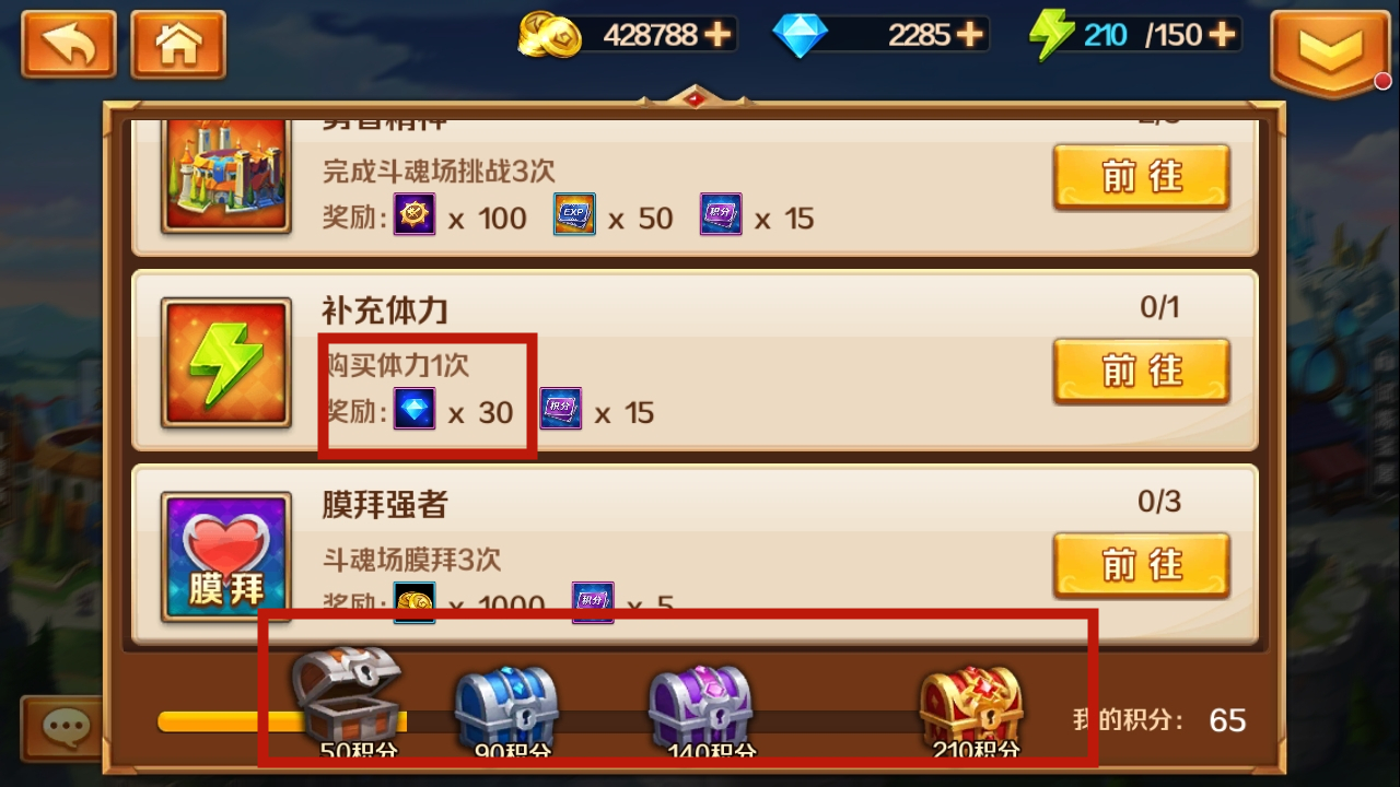 另外,游戏的日常任务里也藏着不少钻石福利。就像图中展示的那样,每天补充一次体力就能拿到30颗钻石(体力不够用的时候试试这个方法挺不错)。再往下看,积分奖励宝箱里更是有大量钻石可以领取——50积分能换20钻石,90积分对应30钻石,140积分能拿到50钻石,210积分则可以兑换100钻石。