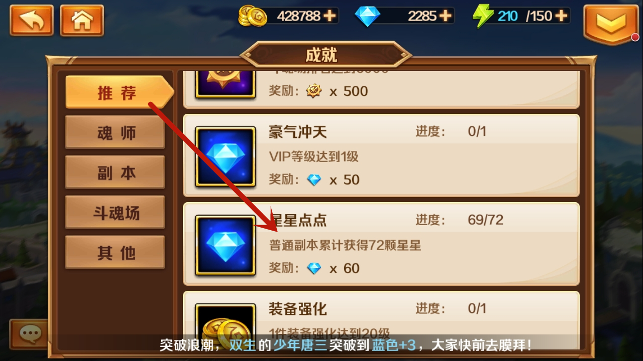 除此之外,我们还可以借助成就系统获取钻石。就像图中所展示的,“星星点点”成就可获得60钻石(该成就总共能产出100钻石),而“豪气冲天”成就则能带来50钻石的奖励。