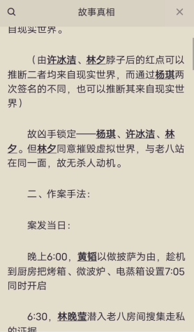 虽然无法确定老八具体的死亡时刻,但根据其尸体尚未僵硬的状态,结合老八来自现实世界这一背景,可以推断杀害他的凶手同样来自现实世界。现实世界的相关人物包括冰洁、林夕和杨琪。不过,林夕与老八在摧毁虚拟世界的立场上是一致的,因此林夕缺乏杀害老八的动机。玩家只要顺着线索逐步推理,就能找出杀死老八的真凶。