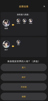 在所有剧情推进完毕后,玩家就会进入投票阶段。这个环节通常会设置几个问题,玩家需要依据对剧情的了解来选出正确答案,要是能答对这些问题,就表明玩家对剧情的理解和掌握比较到位了。另外,消失的凶手也会提出几个相关问题,下面我就对这些问题做个梳理总结,大家可以参考一下。需要明确的是:老八、林夕、许冰洁和杨琪这四个人来自现实世界;“李静双刀案”的策划者是林夕;而杀害老八的凶手则是杨琪。