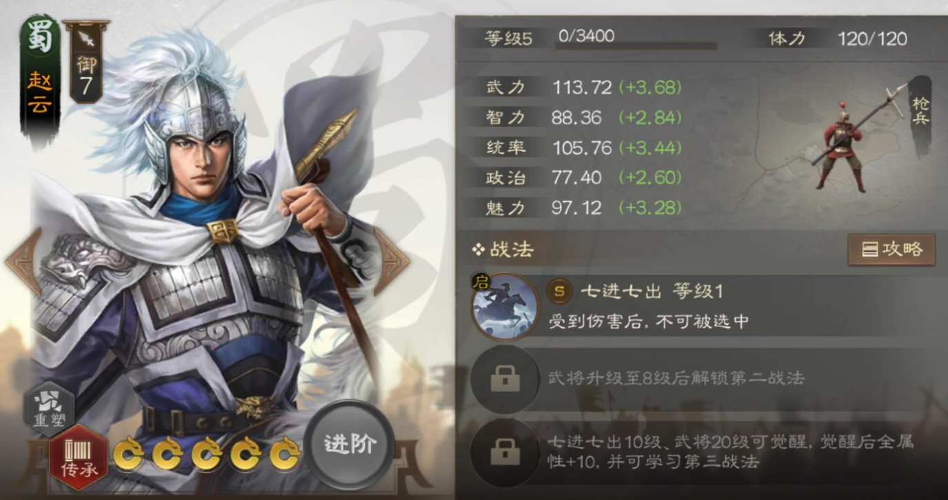 ④赵云:这个角色的强势体现在多个方面。作为枪兵,他却拥有顶尖的武力与统率属性,搭配枪兵独特的伤害计算机制,实战表现十分出色;兵种本身移动力有限的问题也无需顾虑,因为他的战法附带无视地形移动的效果,完美解决了这一短板。不仅如此,其战法还能同时提供属性加成与倒戈效果——也就是说,他在回复能力以及攻防两端的表现都能得到提升。此外,赵云还可依据附近友军的数量获得无法选中状态,这进一步增强了他的生存能力,也让输出环境更加稳定。