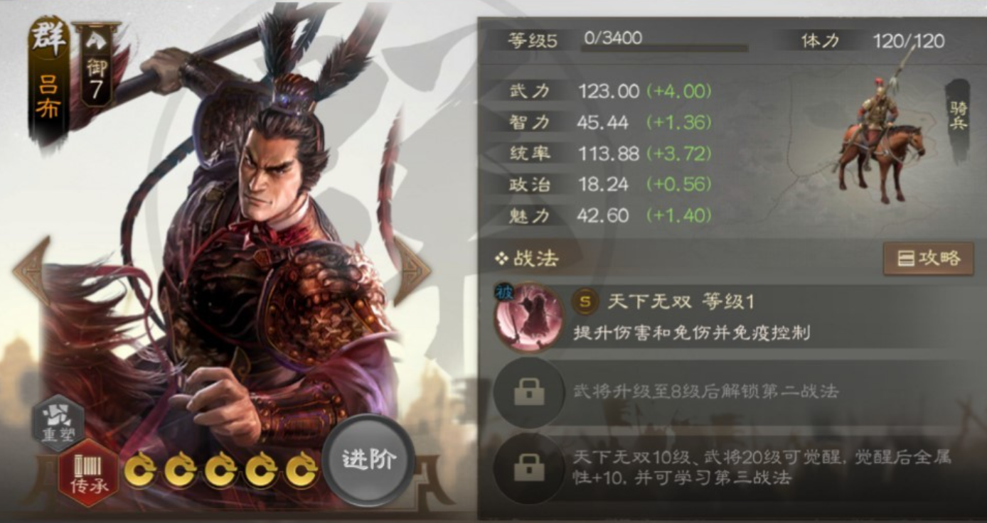 ⑤吕布:全游戏里武力成长数值达到4点的武将仅此一人,同时他的初始武力也是游戏内最高的,这就使得他单靠普通攻击就能打出相当高的伤害。另外值得一说的是,他的战法不仅带有额外的增伤与免伤效果,还能依据阵亡敌人的数量来叠加层数,最高能获得35%的加成,并且叠加到三层后还能免疫控制。再加上他本身是移动力极强的骑兵,所以不管敌人用什么办法,都拦不住他冲进己方阵中肆意冲杀。