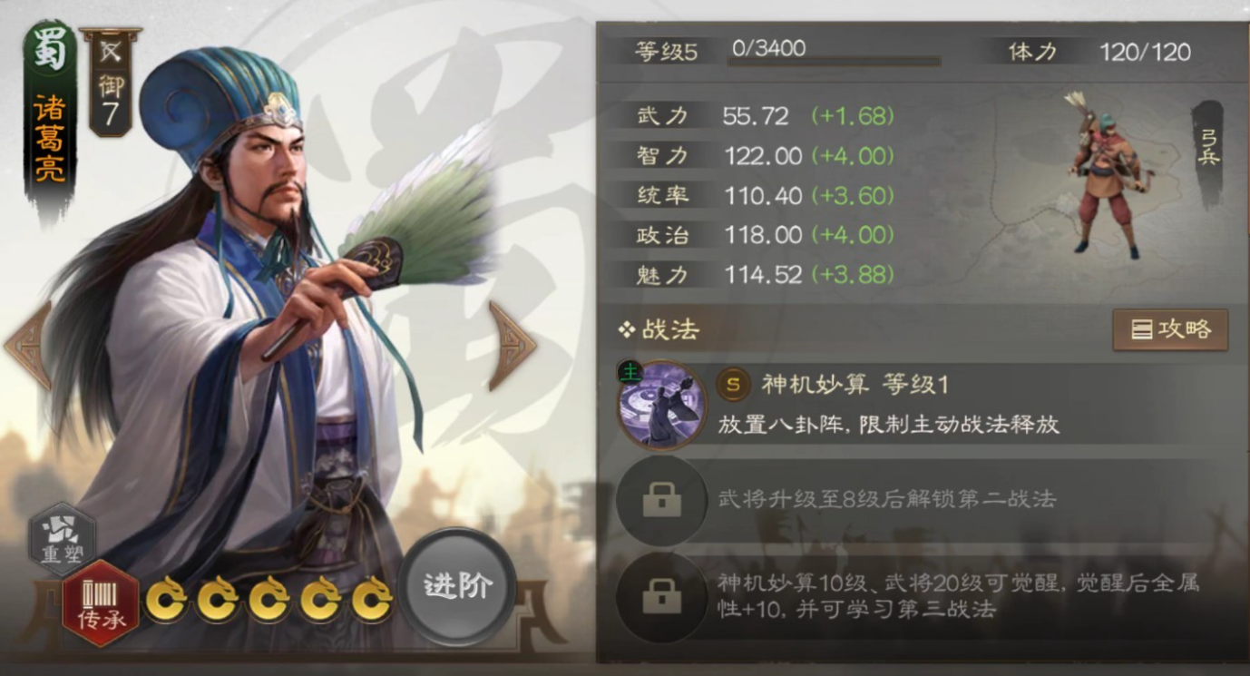 ②诸葛亮:作为智力型武将,他的各项属性较为出色,尤其智力属性突出,这使得他在谋略输出方面表现优异,搭配战法时可侧重这一方向。此外,他的自带战法充分发挥了智力优势,属于范围性谋略伤害,施法距离较远,能同时攻击敌人前排与后排;并且对依赖高频战法输出的敌人限制力极强,因为造成伤害后会附加额外伤害和计穷效果。