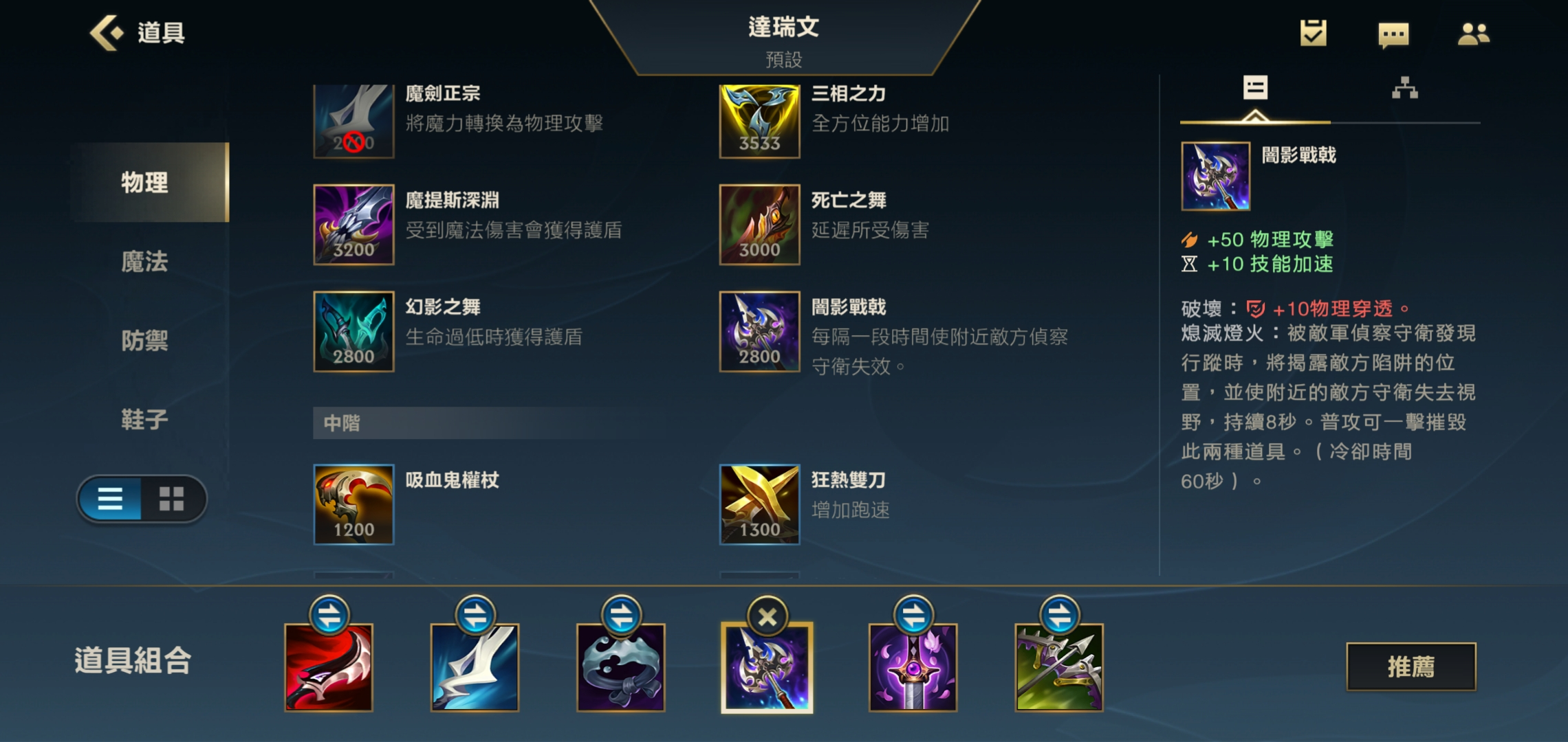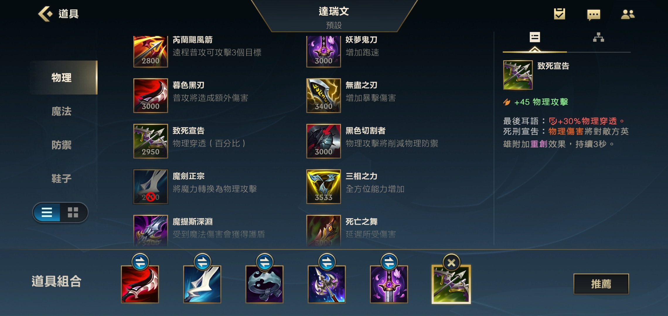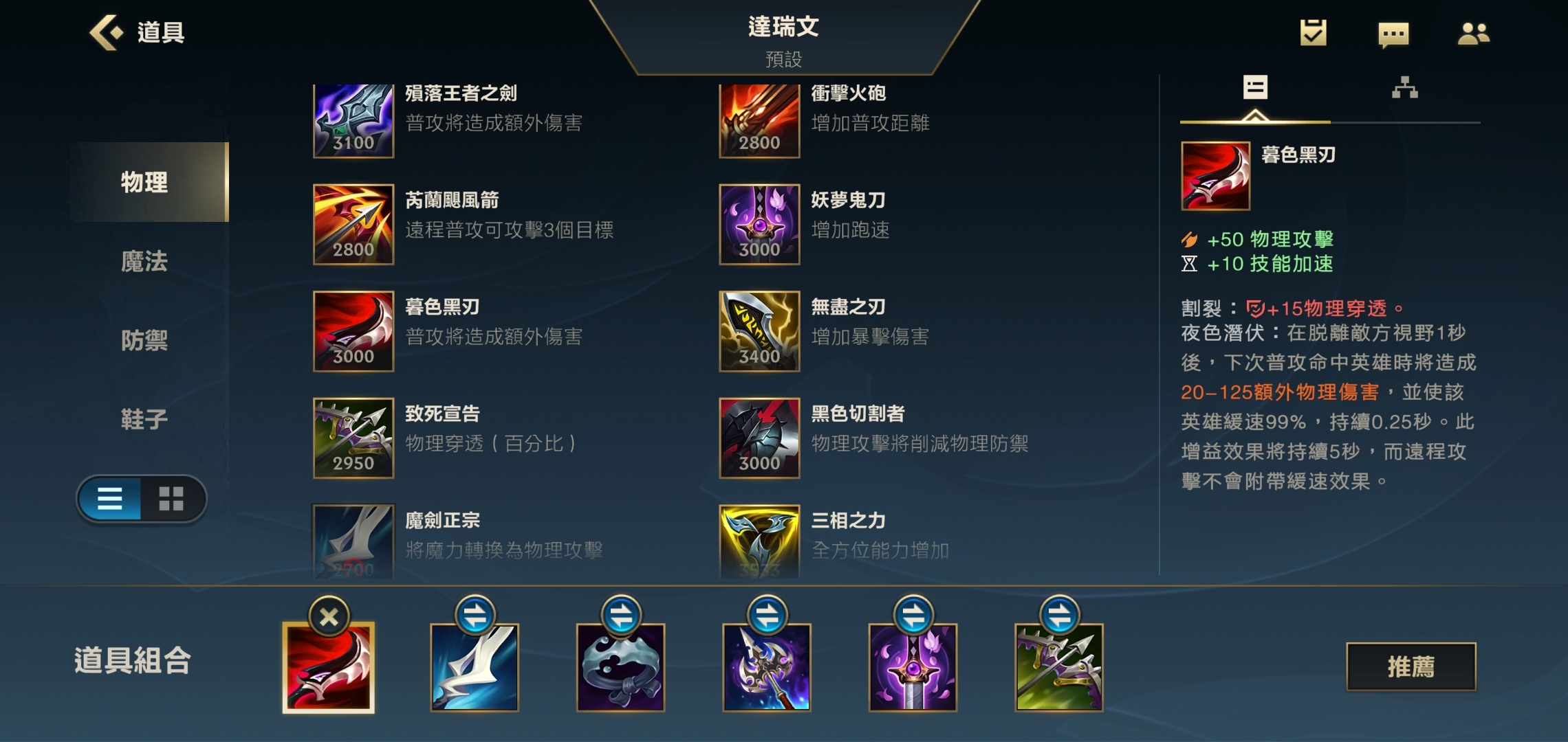 第一件装备我们选择幕刃,它是穿甲流德莱文的核心配置。幕刃能提供可观的攻击力与高额固定物理穿透,更关键的是,它能让德莱文的第一发普攻伤害达到最大化。出完幕刃后,只要敌人失去对我们的视野,下一次普攻就能造成额外伤害。