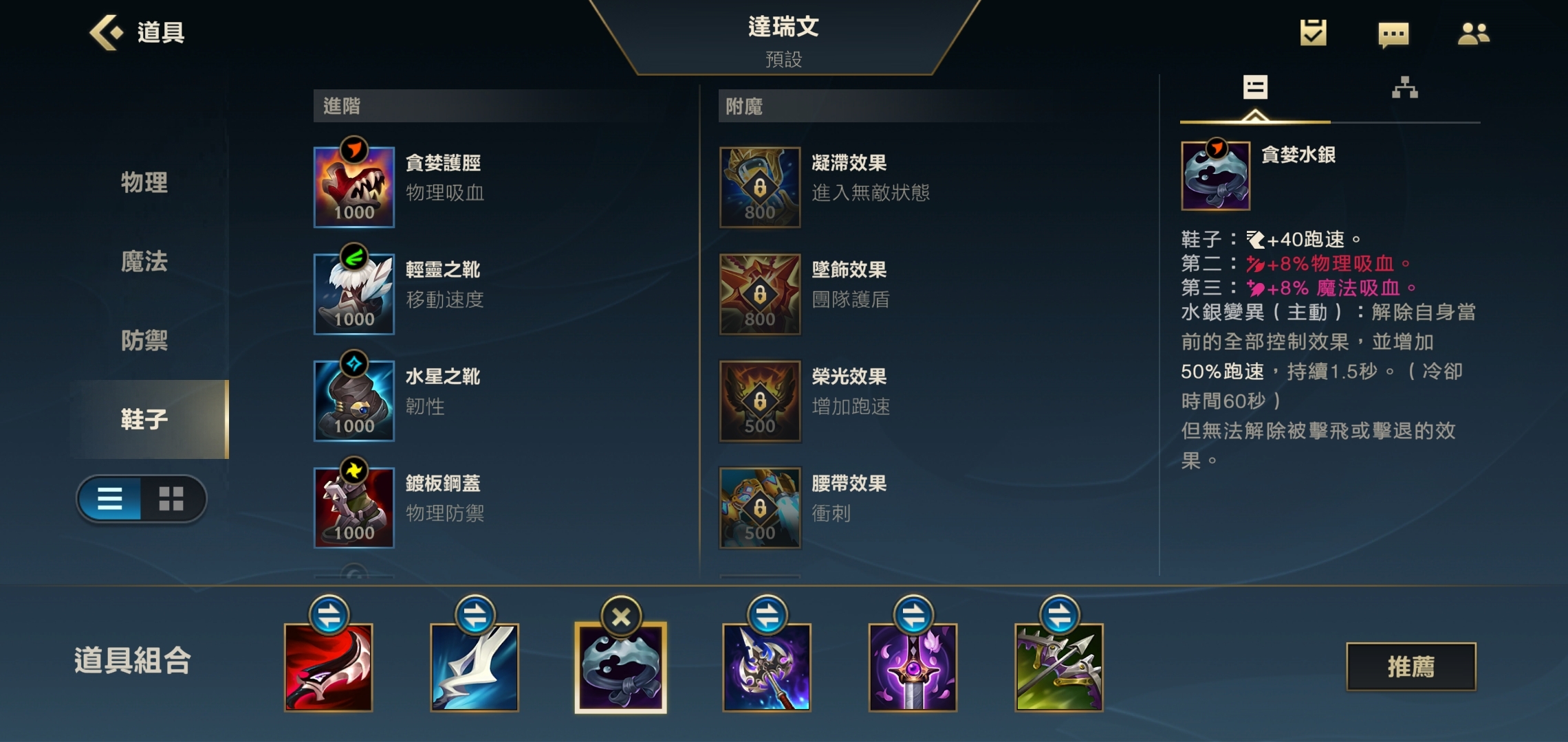 第三件装备我们把吸血鞋换成水银,吸血鞋能提升自身续航能力,水银则可以增加团战中的容错率。