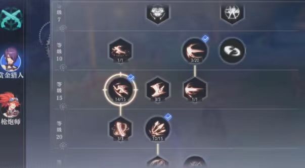 赏金猎人属于火力输出型角色,因此其核心输出技能需要优先升级,比如魔弹装填、烬炎之舞、鹰返、暮色追缉。此外,该角色还有两个高效清怪技能:毁灭弹雨可将怪物聚集,附魔双鹰能快速消灭聚拢的敌人,这两个技能也应优先加点,以便在短时间内完成清怪。