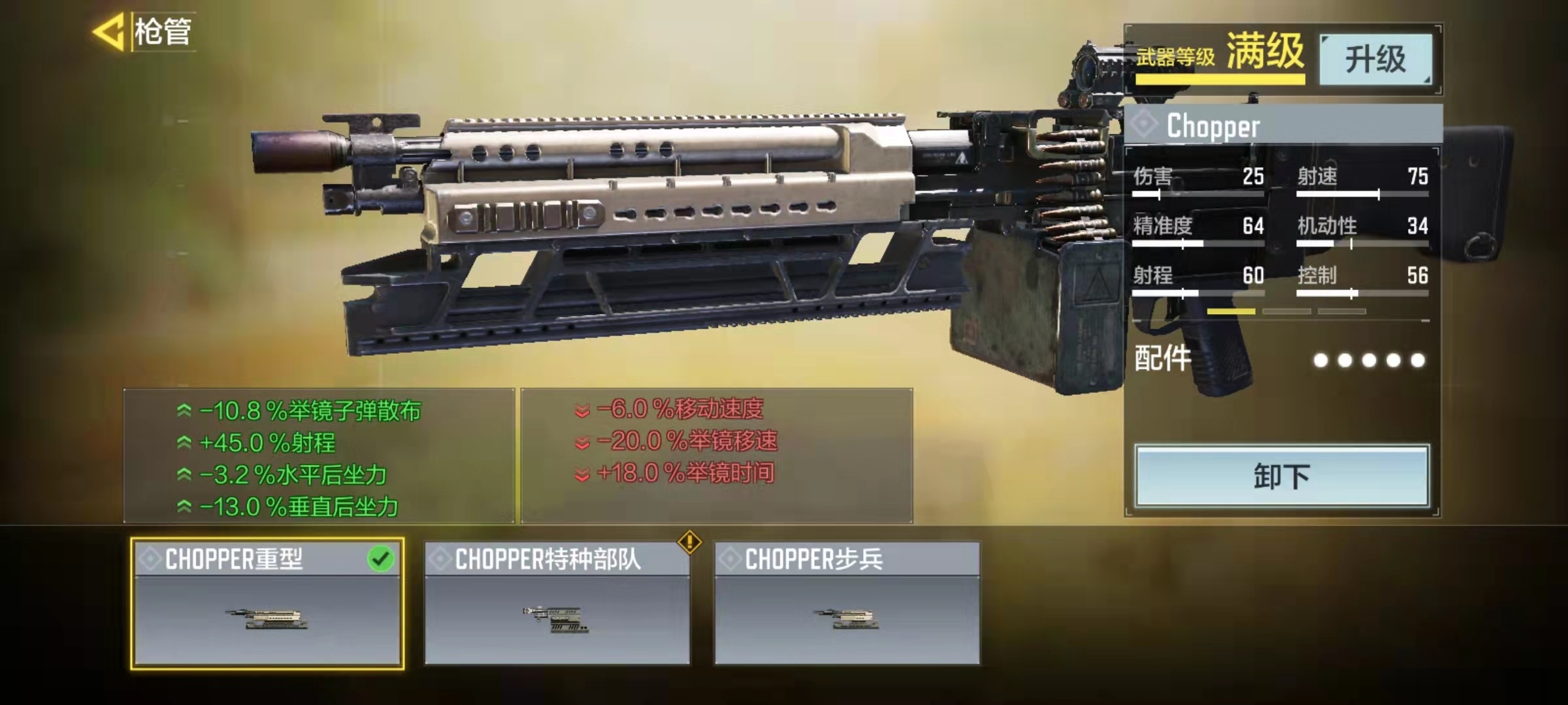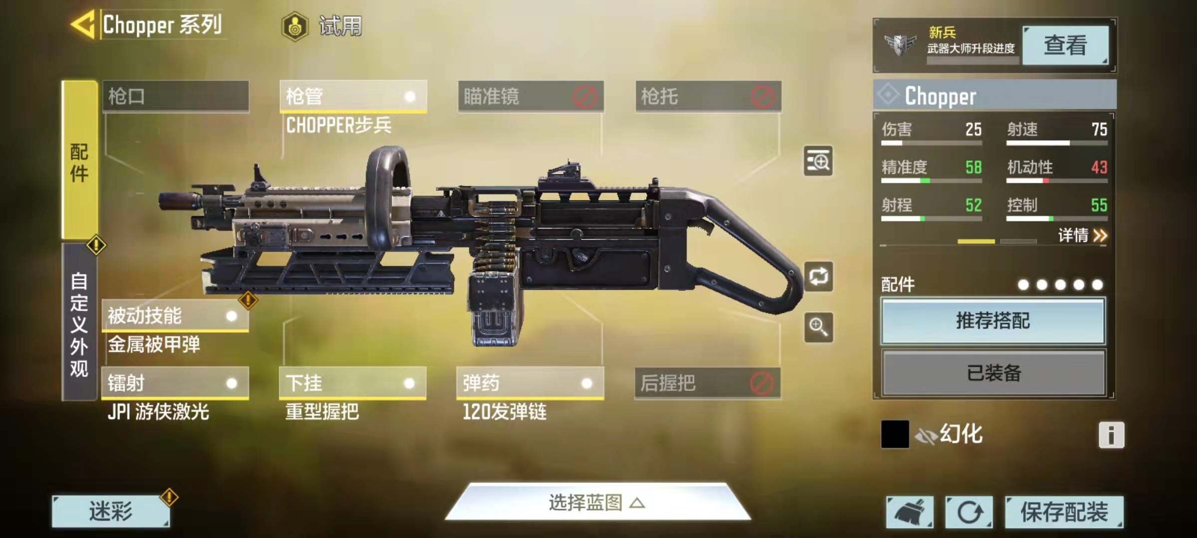 Chopper属于轻机枪范畴,对于这类枪械而言,火力压制能力与射击稳定性是核心要素。尽管Chopper的单发伤害表现平平,但其射速在所有轻机枪中位居榜首,裸枪状态下可达75点。因此在配件搭配时,需着重弥补其短板、放大优势,方能形成最优配置方案。针对Chopper这把枪,这里提供远距离精准射击和中距离火力压制两种配件思路供选择。