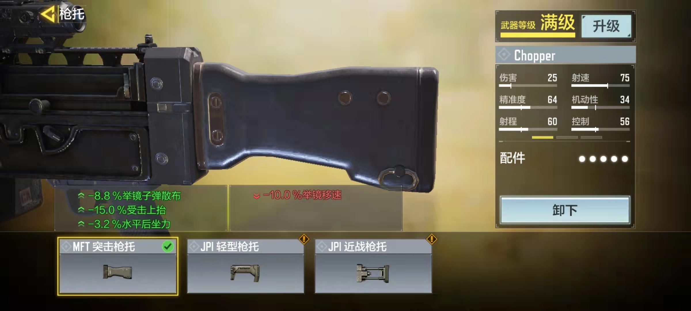 枪托选用MFT突击步枪枪托,可减小子弹散射范围,减轻受击后的枪口上抬幅度,降低水平方向的后坐力。后握把搭配颗粒握把皮,能有效改善开镜状态下的子弹散布情况。通过这些配件组合,我们能获得射程提升、开镜子弹散布优化等属性加成;在远距离交火时,即便遭遇狙击枪,只要对方无法一枪将我们击倒,我们也具备反击甚至取胜的能力。