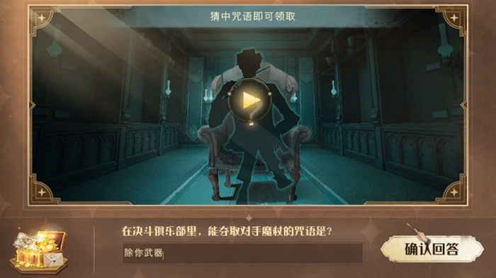 在活动界面,大家能看到“马尔福的入学礼物”活动,只要正确输入答案就能获得丰厚奖励。谜题是:在决斗俱乐部中,能夺取对方魔杖的咒语是什么?看过《哈利波特》原著小说或改编电影系列的小伙伴都清楚,这个咒语就是“除你武器”。我们只需在游戏下方输入“除你武器”这四个字,再点击右侧的“确认回答”按钮即可。