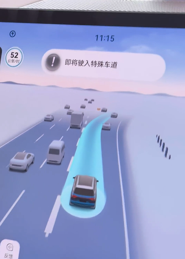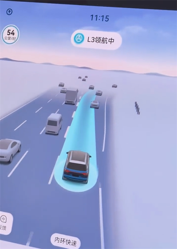 开启L3自动驾驶功能后,中控屏幕会显示“L3领航中”的提示文字,与此同时,在SR渲染界面中,车辆整体会被一条淡蓝色的光毯环绕;当需要手动切换车道时,系统会给出对应的提示信息。