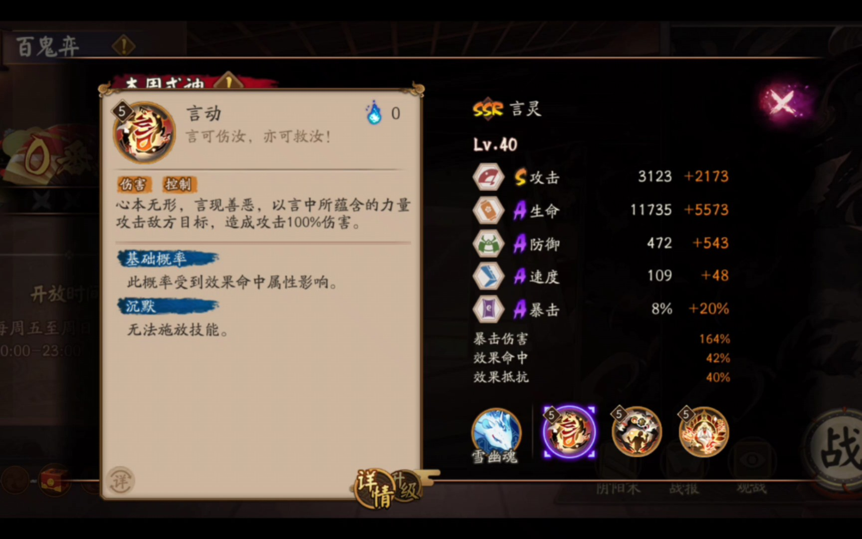 言灵的普通攻击能够对单个敌人造成伤害,当技能升至满级后,会有基础概率使目标进入沉默状态(此概率可通过效果命中类御魂进一步提升)。该式神的被动技能具备叠加拉条的特性,每当敌方回合结束,或是敌方打火机单次提供三点鬼火时,便会叠加一层被动;当被动层数叠满后,言灵就能触发超车效果,对全体敌人发起一次群体攻击,同时自身还会获得护盾的保护。