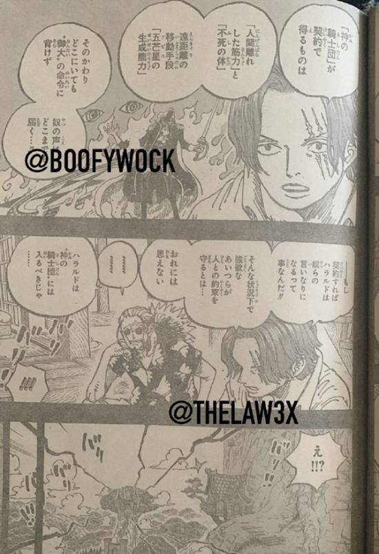 香克斯:“一旦签下那份新契约,‘神之骑士团’就能得到‘超乎常人的力量’与‘不死的躯体’。他们还会被赐予创造‘五芒星(深渊)’的本领,借此跨越遥远的距离。作为交换条件,‘御大’的声音会一直伴随他们直至世界终结。无论他们身在何方,都绝对无法违背‘御大’的命令……!!哈拉尔德再也没办法对他们说‘不’了!!我实在怀疑那些贪婪之徒,真的还会遵守当初的承诺吗……”