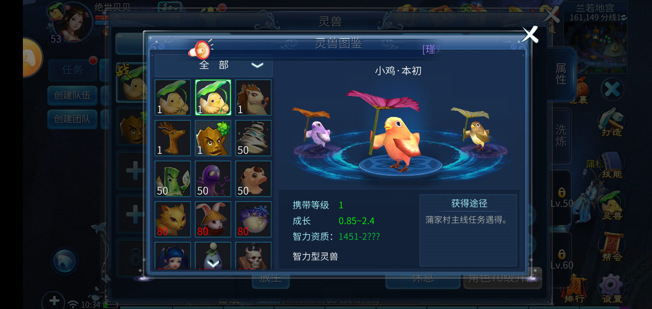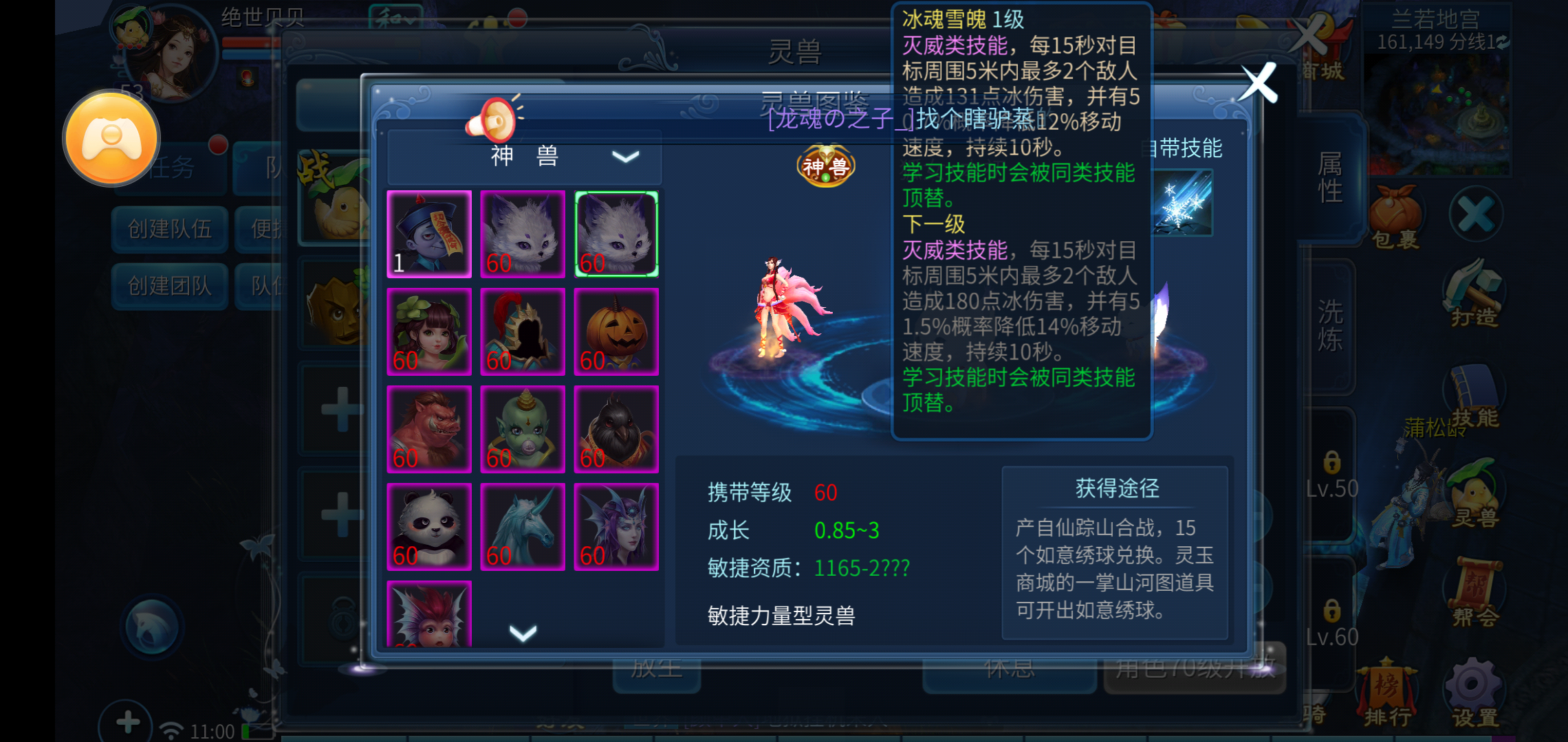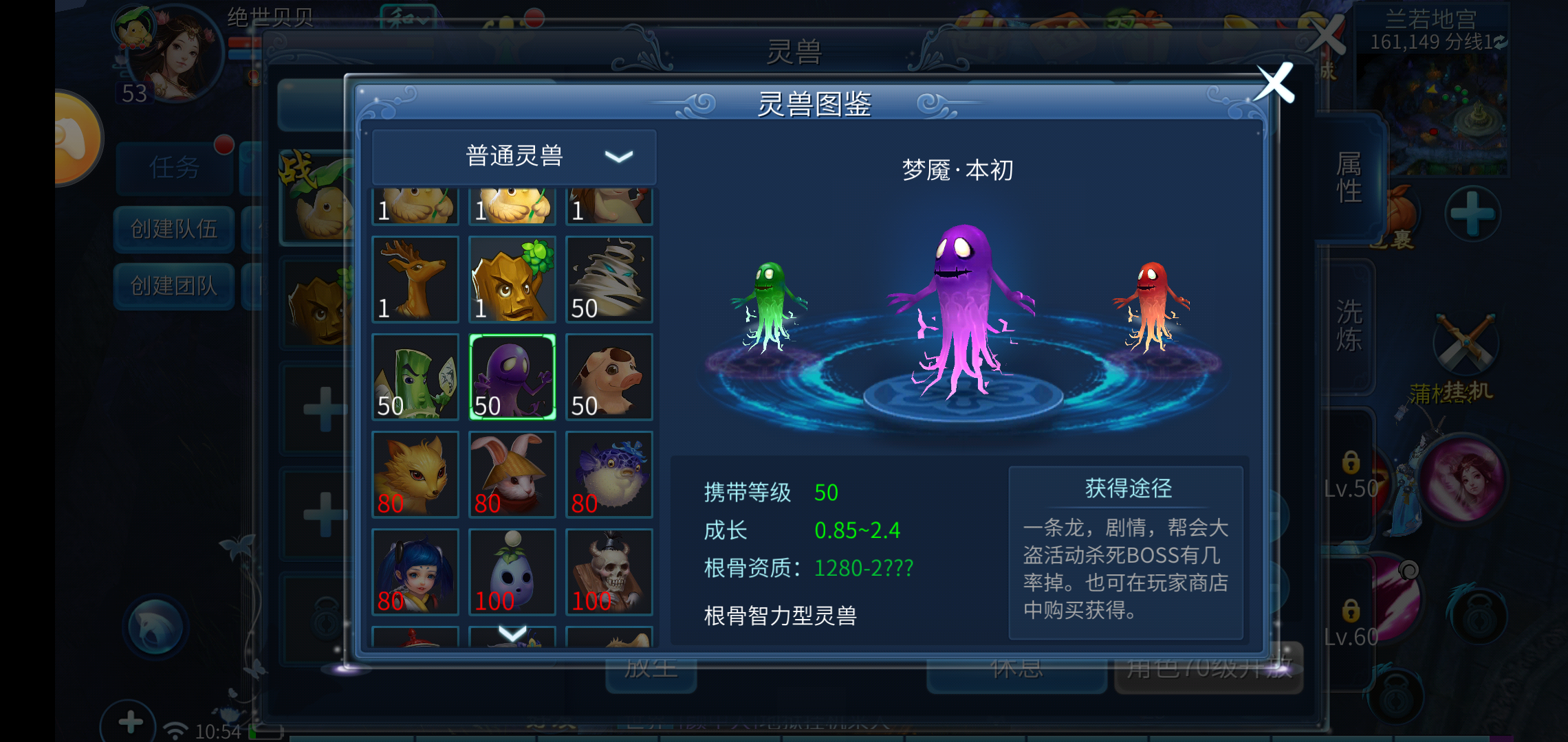 刺猬、鹿铃、木妖的携带等级均为1级;风怪、竹精、梦魇、笑笑猪的携带等级是50级;小狐、兔侠、簪花豚的携带等级为80级;棋童、糖果小鬼、戏迷牛、僵尸力士的携带等级为100级。上述这些灵兽,玩家可通过参与一条龙、剧情、帮会大盗等活动,在击杀BOSS时有几率掉落获取,也能在玩家商店中直接购买获得。