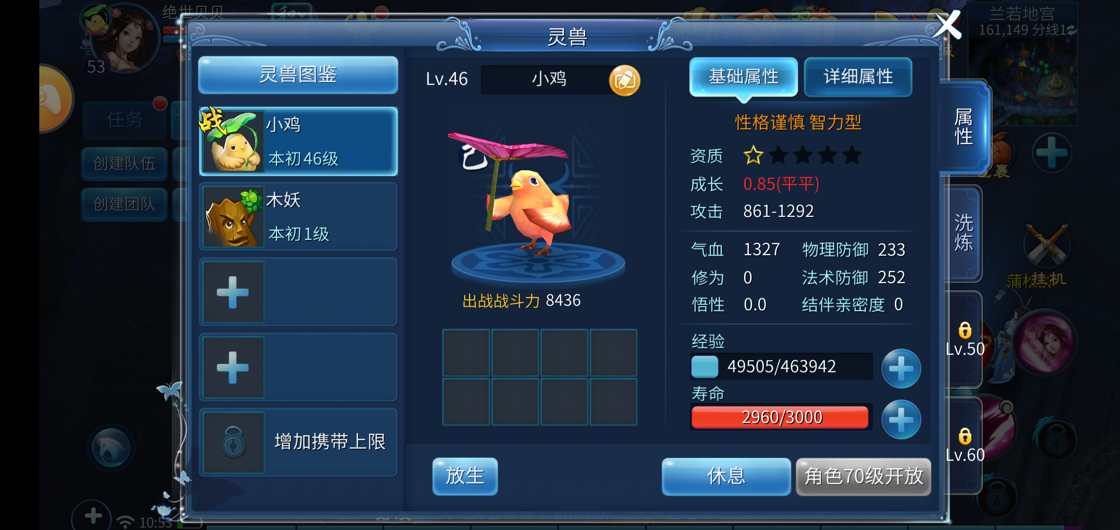 获得灵兽后就能让它跟随自己作战,想要提升灵兽等级的话,可以通过获取人参果来增加它的经验值。经过几轮战斗后,要留意查看灵兽的寿命值,要是寿命不够了,可以利用生活技能或者去商店购买寿元道具来延长它的寿命。