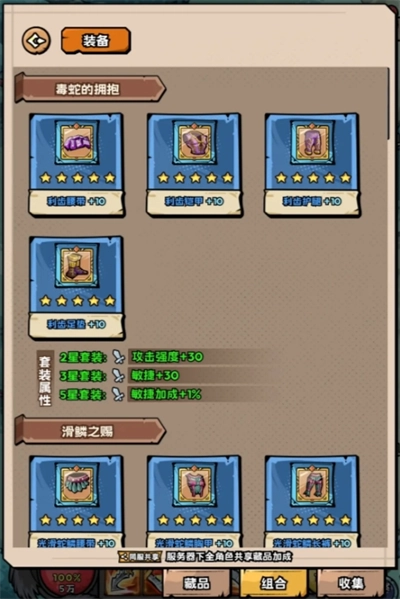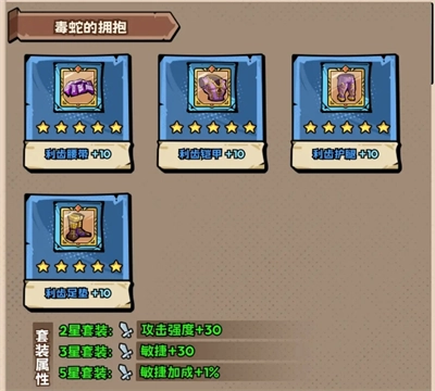 以【毒蛇的拥抱】套装来说,当该套装集齐且全部升至满级时,可获得攻击强度+30、敏捷+30以及敏捷加成+1%的套装属性加成。