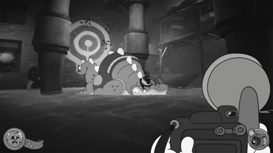 这绝对是近年来视觉风格最具辨识度的射击游戏之一。其创作灵感源于20世纪30年代的经典橡皮管动画(Rubber Hose,像早期米老鼠动画或《茶杯头》那样的风格)。游戏里的每一幅画面都是手工逐帧绘制而成,整体呈现黑白质感,角色的动作设计夸张大胆,肢体线条柔软灵动,处处洋溢着那个年代独有的诙谐趣味。不过可别被这复古可爱的画风误导了——它可是一款货真价实的硬核射击游戏。