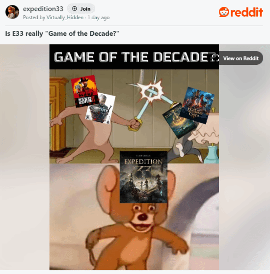 Virtually_Hidden 不禁好奇,未来是否还会有一款游戏能“超越《光与影:33号远征队》将独特精妙的故事与流畅引人入胜的玩法完美融合的高度”——正是这些特质,让它成为十年最佳游戏的有力竞争者。这个重磅问题在社区内引发了激烈争论,玩家们纷纷分享自己对《光与影:33号远征队》与这一顶级荣誉之间距离的看法。