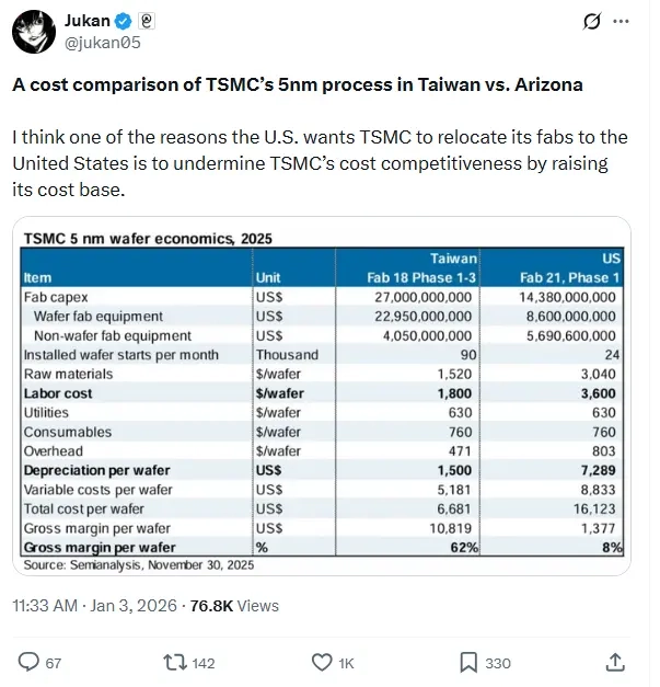 根据分析师Jukan在X平台分享的SemiAnalysis汇总数据,台积电若在美国生产芯片,其利润率会面临大幅下滑。他还指出,美国推动台积电将晶圆厂迁往美国的原因之一,可能是想通过增加该公司的成本来降低其竞争力。