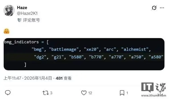1月4日消息,@Haze2K1今日发现,英特尔已在其GitHub仓库中新增了顶级Battlemage显卡——Arc B770的相关代码。这表明Arc B770距离发布已为期不远,最快可能在2026年CES展会上正式亮相。