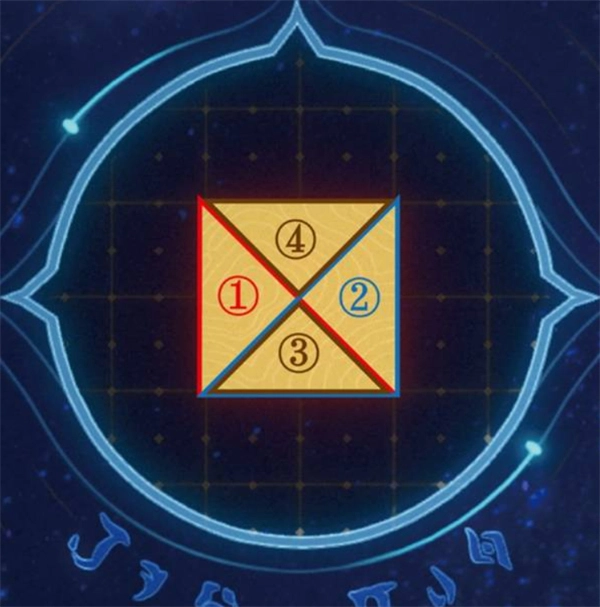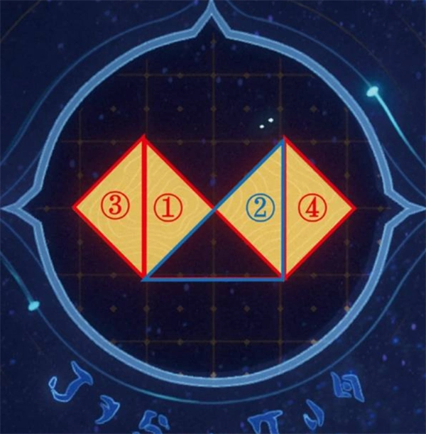 按顺序选择:① 中间偏左的大三角形 → ② 中间偏右的大三角形 → ③ 左边的小三角形 → ④ 右边的小三角形
