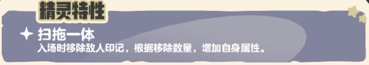 捕尘长绒的种族值如下:生命100、速度120、物攻20、物防15、魔攻20、魔防25 ,这使得它在战斗中具备较高的生存能力以及速度方面的优势。其特性为拖扫一体,入场之际会移除敌人的印记,每成功移除一层印记,自身的攻击与防御属性便会得到提升。所以在面对带有印记的敌人时,捕尘长绒能够快速增强自身战斗力,从而成为战场上得力的辅助角色。